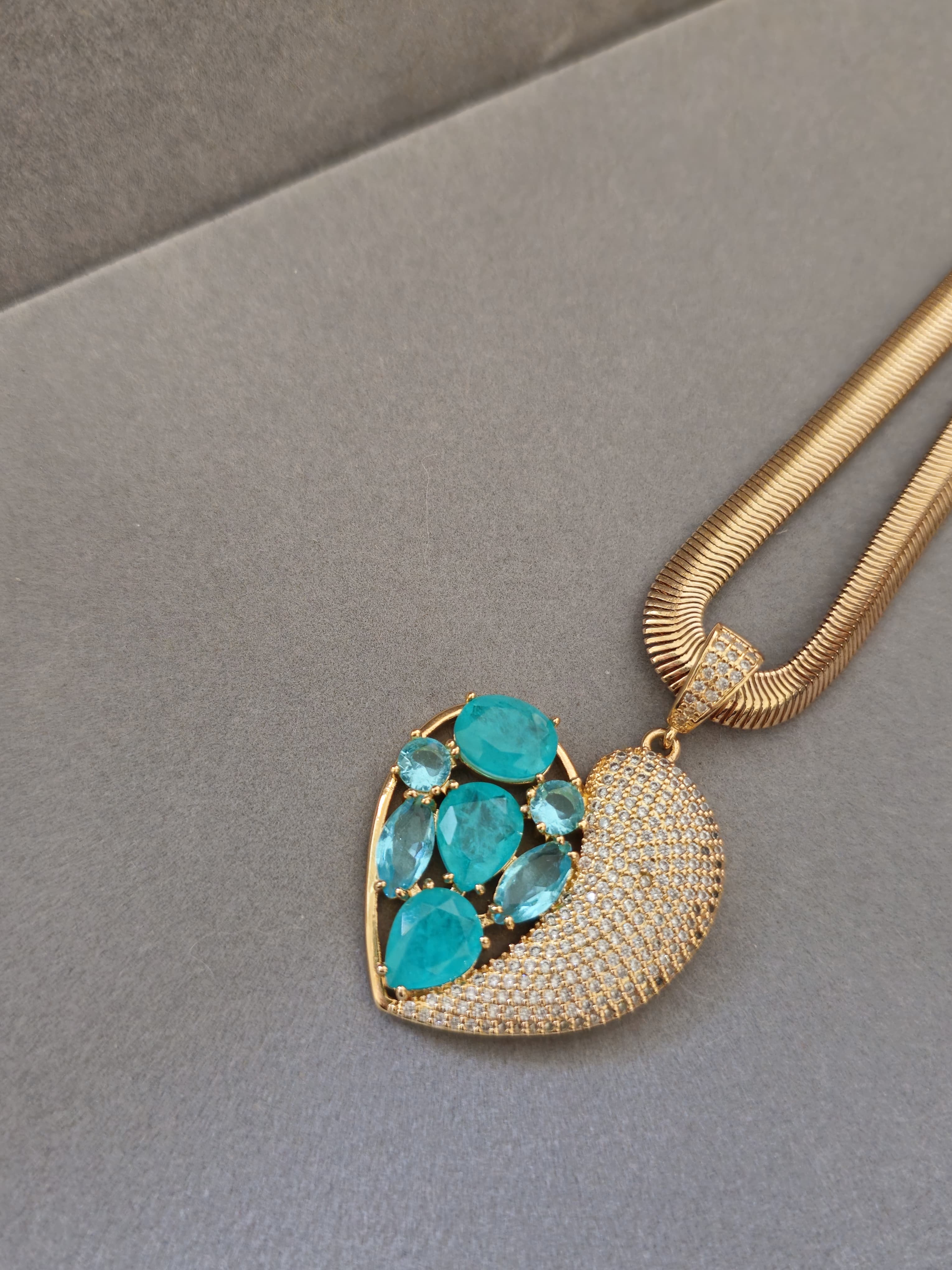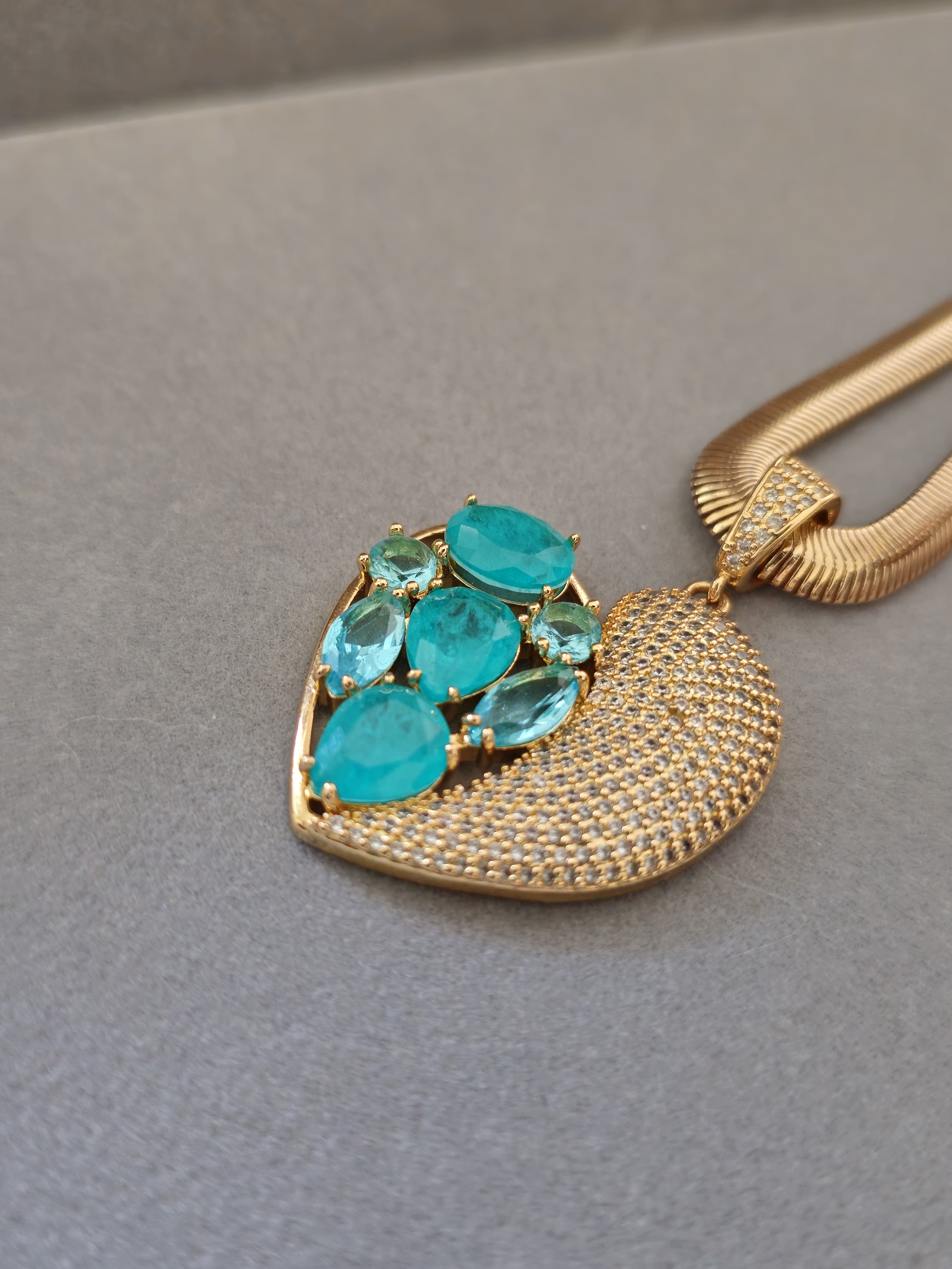 Este magnífico colar traz um coração deslumbrante, cravejado com zircônias reluzentes e quartzo, simbolizando amor, equilíbrio e energia positiva. Seu design sofisticado combina delicadeza e brilho, tornando-se uma peça perfeita para quem deseja expressar sentimentos com elegância.